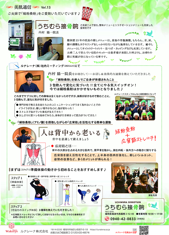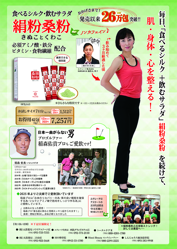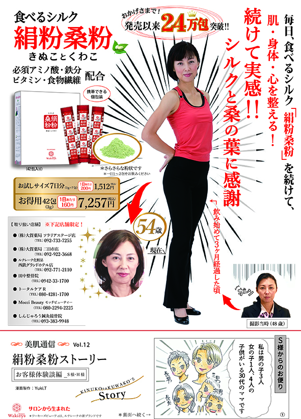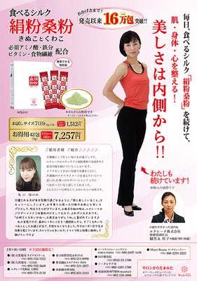 食べるシルク 絹粉桑粉(きぬことくわこ) 「食べるシルク」で 美肌と健康になる!!2023.07.15.COPPA ITALIA ビーチ女子サッカーで優勝した串山早希選手イタリアでもご愛飲 絹粉桑粉 —きぬことくわこ― 販売価格 7,257円(税込み) 会員価格 (税込み) 通常価格 (税込み) 在庫 商品コード W-13 JANコード 4544903422348 数量 1 2 3 4 5 6 7 8 9 10 カートに入れる カテゴリー 食べるシルク(健康食品) メーカー ルナレーナ化粧品 ブランド ワーキーズビューティ 便種 宅急便 【お召し上がり方】そのままお召し上がりいただくか、水やお湯に溶いてお飲みください。牛乳・豆乳・ヨーグルトなどに混ぜても、美味しくお召し上がりいただけます。1日に1~2包(3~6g)を目安にお召し上がりください。※たんぱく質アレルギーの方は、服用をお控えください。体質に合わない場合は、摂取を中止し専門医にご相談ください。【原材料名】加水分解シルク・桑の葉粉末※絹粉桑粉は軽減税率対象商品です。 ツイートする シェアする